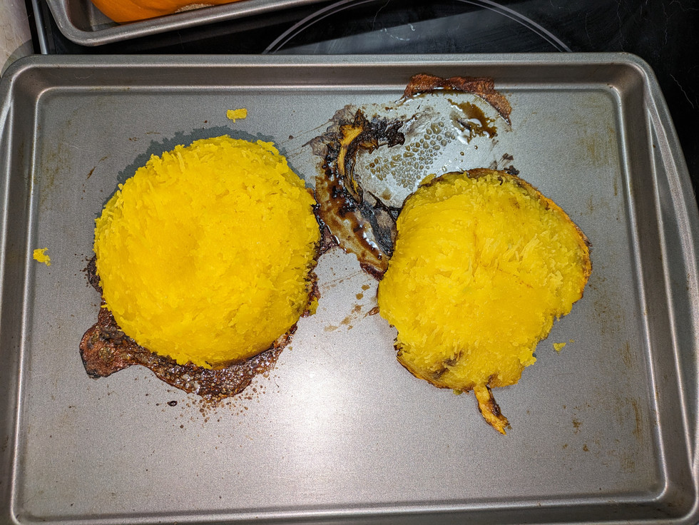 First I put them all in the sink and washed off all of the dirt and broke the stems off. I've found that by taking the stems off before attempting to cut them I have an easier time cutting through them. Next, was the arduous task of cutting and cleaning them. My cutting board could only hold four halves at a time, so I had to keep placing them on the baking sheet as I finished them. I saved all of the seeds and guts in a separate bowl to deal with later. I'll bake most of the seeds to have as a snack, but the guts will end up going to the chickens or the composter.